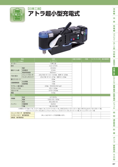 【日東工器】アトラ超小型充電式日極(3日保証)月極セーフティサービス料基本管理料商品アトラエース充電式メーカー型式電気ドリル部穴あけ能力最大ストローク位置調整範囲電圧定格電流無負荷回転数ジェットブローチワンタッチタイプ左右移動前後移動マグネット最大磁力マグネット寸法寸法:H×W質量付属品充電器バッテリ型式電源型式充電時間予備仕様S-JB27J日東工器CLO-2725DC36V2.5Ah820min-120L穴径:Φ11.5〜13.5㎜板厚:6〜20㎜25L穴径:Φ14〜27㎜板厚:6〜25㎜40㎜10㎜10㎜22㎜5500N(561㎏f)65×145㎜476×309㎜9.0㎏UC18YDL100V50/60㎐BCL36A18約25分1個(合計2個)六角棒スパナ3㎜×1本、スパナ14㎜×1本、スパナ(7×9)×1本、六角穴付ボルト(5×12)×1個、六角穴付止めネジ(8×28)×1個、ベルトラッシング×1本、送りハンドル×1本、チューブ(4×7)×1本、オイラー×1個、キャリングケース×1個ジェットブローチ替刃販売品パイロットピン替刃販売品切削油替刃販売品詳しくは218ページを参照願います。297