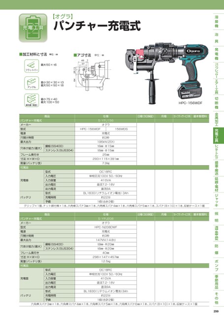 【オグラ】パンチャー充電式■加工材料と寸法単位:㎜■アゴ寸法単位:㎜HPC-156WDF日極(3日保証)月極セーフティサービス料基本管理料最大50×t6フラットバー最小30×30×t3最大50×50×t6アングル最小75×40最大100×50溝形鋼(側面)商品パンチャー充電式メーカー型式電源穴開け時間最大出力穴あけ能力(最大)フレーム奥行き寸法:H×W×D質量(バッテリ含)付属品充電器バッテリ鋼板(SS400)ステンレス(SUS304)型式入力電圧入力容量出力電圧出力電流型式充電時間予備仕様S-YPJ156オグラHPC-156WDF156WDS充電式約3秒196kN(20t)t6㎜-Φ15㎜t6㎜-Φ15㎜25㎜293×115×391㎜7.9㎏DC18RC単相交流100V50/60㎐410VA直流7.2-18V直流9ABL1830(リチウムイオン電池)3Ah約22分1個(合計2個)グリップ×1個、ナット締付棒×1本、六角棒スパナ3㎜×1本、六角棒スパナ4㎜×1本、六角棒スパナ5㎜×1本、スパナ(8×10)×1本、収納ケース×1個日極(3日保証)月極セーフティサービス料基本管理料パンチャー充電式メーカー型式電源穴開け時間最大出力穴あけ能力(最大)フレーム奥行き寸法:H×W×D質量(バッテリ含)付属品充電器バッテリ商品鋼板(SS400)ステンレス(SUS304)型式入力電圧入力容量出力電圧出力電流型式充電時間予備仕様S-YPJ208オグラHPC-N208DWF充電式約3秒147kN(14.8t)t8㎜-Φ20㎜t6㎜-Φ20㎜40㎜298×147×457㎜12.5㎏DC18RC単相交流100V50/60㎐410VA直流7.2-18V直流9ABL1830(リチウムイオン電池)3Ah約22分1個(合計2個)六角棒スパナ3㎜×1本、六角棒スパナ4㎜×1本、六角棒スパナ5㎜×1本、六角棒スパナ6㎜×1本、スパナ(8×10)×1本、収納ケース×1個299