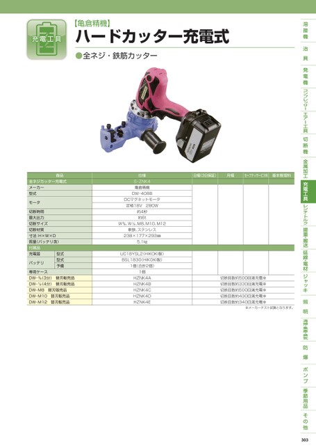 【亀倉精機】ハードカッター充電式●全ネジ・鉄筋カッター商品全ネジカッター充電式メーカー型式モータ切断時間最大出力切断サイズ切断材質寸法:H×W×D質量(バッテリ含)付属品充電器バッテリ型式型式予備専用ケースDW-(3分)替刃販売品DW-(4分)替刃販売品DW-M8替刃販売品DW-M10替刃販売品DW-M12替刃販売品仕様S-ZNK4亀倉精機DW-408BDCマグネットモータ定格18V280W約4秒約6tW、W、M8、M10、M12軟鉄、ステンレス238×177×293㎜5.1㎏UC18YSL2(HIKOKI製)BSL1830(HIKOKI製)1個(合計2個)1個HZNK4AHZNK4BHZNK4CHZNK4DHZNK4E日極(3日保証)月極セーフティサービス料基本管理料切断回数約500回満充電※切断回数約330回満充電※切断回数約500回満充電※切断回数約430回満充電※切断回数約340回満充電※※メーカーテスト試算となります。303