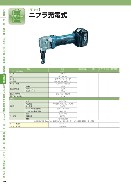 【マキタ】ニブラ充電式日極(3日保証)月極セーフティサービス料基本管理料仕様S-NBLJマキタJN161DRF直流マグネットモータリチウムイオンバッテリ1900min-1(回/分)1.6㎜1.2㎜2.5㎜313×78×189㎜2.1㎏DC18RF単相交流100V50/60㎐330W直流14.4-18V直流12ABL1430B約22分1個(合計2個)六角棒スパナ2.5㎜×1本、スパナ32㎜×1本、バッテリカバ-×2個、専用ケース×1個、HNBLJ1HNBLJ2商品軟鋼板ステンレスアルミニウムニブラ1.6㎜充電式メーカー型式モータバッテリストローク数最大切断能力寸法:L×W×H質量(バッテリ除く)付属品型式入力電圧入力容量バッテリ充電出力電圧バッテリ充電出力電流型式充電時間予備充電器バッテリダイス販売品パンチ販売品314