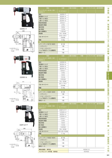 商品仕様日極(3日保証)月極セーフティサービス料基本管理料ナットランナーM16/20GSR51T型式常用最大トルク下限トルク能力上限トルク能力無負荷回転数繰返締付精度電圧単相最大電流最大消費電力周波数寸法:W×D×H質量付属レバーソケットM16・M20(-)ドライバー(-)ベビードライバー(トルク設定ダイヤル調整用)専用ケース商品ナットランナーM20/22GSR81A型式常用最大トルク下限トルク能力上限トルク能力無負荷回転数繰返締付精度電圧単相最大電流最大消費電力周波数寸法:W×D×H質量付属レバーソケットM20・M22(-)ドライバー(-)ベビードライバー(トルク設定ダイヤル調整用)専用ケース商品ナットランナーM22/24GSR121T型式常用最大トルク下限トルク能力上限トルク能力無負荷回転数繰返締付精度電圧単相最大電流最大消費電力周波数寸法:W×D×H質量付属レバーソケットM22・M24(-)ドライバー(-)ベビードライバー(トルク設定ダイヤル調整用)専用ケース検査成績表販売品トレサビリティ体系図販売品S-STO201GSR51T500N・ⅿ200N・ⅿ500N・ⅿ23min-1±5%100V13.5A1350W50/60㎐245×68×286㎜4.9㎏各1個1個1個1個仕様S-STO221GSR81A800N・ⅿ350N・ⅿ800N・ⅿ19min-1±5%100V16.0A1550W50/60㎐251×75×294㎜5.4㎏各1個1個1個1個仕様S-STO241GSR121T1200N・ⅿ600N・ⅿ1200N・ⅿ10min-1±5%100V14.5A1400W50/60㎐290×85×304㎜7.1㎏各1個1個1個1個GSR51TGSR81AGSR121T※M20用レバーソケット装着寸法図※M22用レバーソケット装着寸法図※M24用レバーソケット装着寸法図日極(3日保証)月極セーフティサービス料基本管理料日極(3日保証)月極セーフティサービス料基本管理料KENS10KENS5331