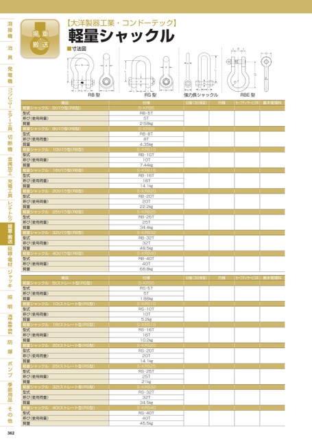 dL1tBtDdd3BtDt強力長シャックルRRBE型日極(3日保証)月極セーフティサービス料基本管理料日極(3日保証)月極セーフティサービス料基本管理料【大洋製器工業・コンドーテック】軽量シャックル■寸法図LB1d3d3tBtRB型dDL1d3BttRS型dD1商品軽量シャックル5tバウ型(RB型)型式呼び(使用荷重)質量軽量シャックル8tバウ型(RB型)型式呼び(使用荷重)質量軽量シャックル10tバウ型(RB型)型式呼び(使用荷重)質量軽量シャックル16tバウ型(RB型)型式呼び(使用荷重)質量軽量シャックル20tバウ型(RB型)型式呼び(使用荷重)質量軽量シャックル25tバウ型(RB型)型式呼び(使用荷重)質量軽量シャックル32tバウ型(RB型)型式呼び(使用荷重)質量軽量シャックル40tバウ型(RB型)型式呼び(使用荷重)質量商品軽量シャックル5tストレート型(RS型)型式呼び(使用荷重)質量軽量シャックル10tストレート型(RS型)型式呼び(使用荷重)質量軽量シャックル16tストレート型(RS型)型式呼び(使用荷重)質量軽量シャックル20tストレート型(RS型)型式呼び(使用荷重)質量軽量シャックル25tストレート型(RS型)型式呼び(使用荷重)質量軽量シャックル32tストレート型(RS型)型式呼び(使用荷重)質量軽量シャックル40tストレート型(RS型)型式呼び(使用荷重)質量362仕様S-KRB5RB-5T5T2.58㎏S-KRB8RB-8T8T4.35㎏S-KRB10RB-10T10T7.44㎏S-KRB16RB-16T16T14.1㎏S-KRB20RB-20T20T22.2㎏S-KRB25RB-25T25T34.4㎏S-KRB32RB-32T32T48.5㎏S-KRB40RB-40T40T68.8㎏仕様S-KRS5RS-5T5T1.86㎏S-KRS10RS-10T10T5.2㎏S-KRS16RS-16T16T10.2㎏S-KRS20RS-20T20T14.1㎏S-KRS25RS-25T25T21㎏S-KRS32RS-32T32T34.5㎏S-KRS40RS-40T40T45.5㎏
