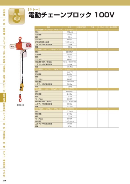 【キトー】電動チェーンブロック100V商品仕様日極(3日保証)月極セーフティサービス料基本管理料100V電動チェーンブロック240㎏10m型式定格荷重揚程モータ出力定格負荷時巻上速度上下フック間の最小距離質量100V電動チェーンブロック240㎏10m2速式型式定格荷重揚程モータ出力巻上速度(最高/最低速)上下フック間の最小距離質量100V電動チェーンブロック240㎏20m型式定格荷重揚程モータ出力巻上速度上下フック間の最小距離質量100V電動チェーンブロック240㎏20m2速式型式定格荷重揚程モータ出力巻上速度(最高/最低速)上下フック間の最小距離質量100V電動チェーンブロック240㎏50m型式定格荷重揚程モータ出力巻上速度上下フック間の最小距離質量S-C02E10ED24S240㎏10m600W13.5m/min330㎜20㎏S-C2ST10ED24ST240㎏10m600W13.5/3.0m/min330㎜20.4㎏S-C02E20ED24S240㎏20m600W13.5m/min330㎜25㎏S-C2ST20ED24ST240㎏20m600W13.5/3.0m/min330㎜23.9㎏S-C02E50ED24S240㎏50m600W13.5m/min380㎜45㎏ED24S374