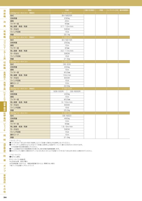 日極(3日保証)月極セーフティサービス料基本管理料商品230㎏ベビーホイスト無線式型式定格荷重揚程ワイヤー径巻上速度微速/高速モータ出力ウインチ定格質量250㎏ベビーホイスト無線式型式定格荷重揚程ワイヤー径巻上速度微速/高速モータ出力ウインチ定格質量400㎏ベビーホイスト型式定格荷重揚程ワイヤー径巻上速度低速/高速モータ出力ウインチ定格操作コード質量400㎏ベビーホイスト無線式型式定格荷重揚程ワイヤー径巻上速度低速/高速モータ出力ウインチ定格質量460㎏ベビーホイスト型式定格荷重揚程ワイヤー径巻上速度低速/高速モータ出力ウインチ定格操作コード質量仕様S-BBH23RBH-N820R230㎏20mΦ5㎜3.7/12m/min580W15分22.1㎏S-BBH25RBH-N815R250㎏15mΦ5㎜3.2/11m/min580W15分21.5㎏S-BBH400DB-930400㎏15mΦ5.5㎜10m/min800W15分10m22.0㎏S-BBH40RSDB-930RDB-N930R400㎏15mΦ5.5㎜3/10m/min800W15分25.0㎏S-BBH460DB-N820460㎏10mΦ6㎜1.9/6m/min580W15分15m21.0㎏◇マイティアーム●パイプΦ42.7またはΦ48.6を使用したパイプ足場への取付以外は使用しないでください。●マイティアームを取付けようとするパイプ足場には負荷による曲げモーメント(最大2.65kN-m)がかかります。十分な強度である事を確認してください。●アームは旋回するので旋回範囲200度に対し取付足場の強度確認願います。●取付クランプ(3箇所)の締め付けナットは34.3N-mのトルクで足場パイプ(Φ42.7またはΦ48.6)に締め付けてください。◇ベビーホイスト●雨ざらし厳禁。【ベビーホイスト無線式】※429M㎐帯特定小電力水平送信距離100m以上垂直送信距離50m以上(障害のない場合)下部フックは全種ラッチロックフック384