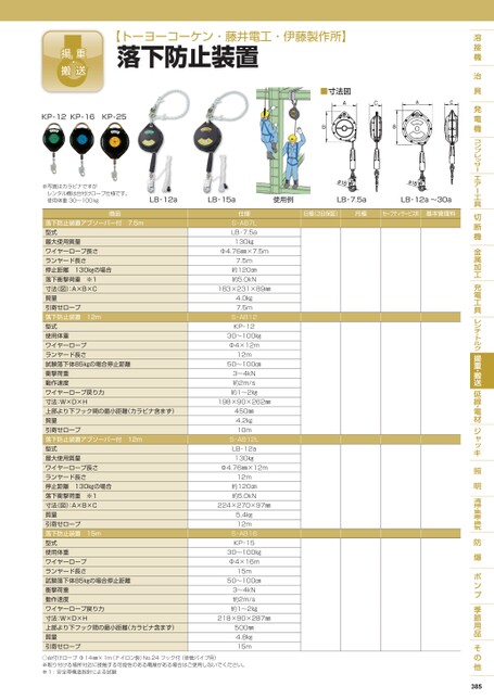 【トーヨーコーケン・藤井電工・伊藤製作所】落下防止装置■寸法図KP-12KP-16KP-25※写真はカラビナですがレンタル機は台付けロープ仕様です。使用体重30〜100㎏商品落下防止装置アブソーバー付7.5m型式最大使用質量ワイヤーロープ長さランヤード長さ停止距離130㎏の場合落下衝撃荷重※1寸法(図):A×B×C質量引寄せロープ落下防止装置12m型式使用体重ワイヤーロープランヤード長さ試験落下体85㎏の場合停止距離衝撃荷重動作速度ワイヤーロープ戻り力寸法:W×D×H上部より下フック間の最小距離(カラビナ含まず)質量引寄せロープ落下防止装置アブソーバー付12m型式最大使用質量ワイヤーロープ長さランヤード長さ停止距離130㎏の場合落下衝撃荷重※1寸法(図):A×B×C質量引寄せロープ落下防止装置15m型式使用体重ワイヤーロープランヤード長さ試験落下体85㎏の場合停止距離衝撃荷重動作速度ワイヤーロープ戻り力寸法:W×D×H上部より下フック間の最小距離(カラビナ含まず)質量引寄せロープLB-12aLB-15a使用例LB-7.5aLB-12a〜30a日極(3日保証)月極セーフティサービス料基本管理料仕様S-AB7LLB-7.5a130㎏Φ4.76㎜×7.5m7.5ⅿ約120㎝約5.0kN183×231×89㎜4.0㎏7.5mS-AB12KP-1230〜100㎏Φ4×12m12m50〜100㎝3〜4kN約2m/s約1〜2㎏198×90×262㎜450㎜4.2㎏10mS-AB12LLB-12a130㎏Φ4.76㎜×12m12ⅿ約120㎝約5.0kN224×270×97㎜5.4㎏12mS-AB16KP-1530〜100㎏Φ4×16m15m50〜100㎝3〜4kN約2m/s約1〜2㎏218×90×287㎜500㎜4.8㎏15m○台付けロープΦ14㎜×1m(ナイロン製)No.24フック付(単管パイプ用)※取り付ける場所付近に接触する可能性のある電線がある場合はご使用しないでください。※1:安全帯構造指針による試験385