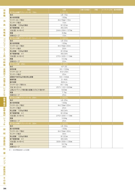 日極(3日保証)月極セーフティサービス料基本管理料商品落下防止装置アブソーバー付15m型式最大使用質量ワイヤーロープ長さランヤード長さ停止距離130㎏の場合落下衝撃荷重※1寸法(図):A×B×C質量引寄せロープ落下防止装置アブソーバー付20m型式最大使用質量ワイヤーロープ長さランヤード長さ停止距離130㎏の場合落下衝撃荷重※1寸法(図):A×B×C質量引寄せロープ落下防止装置25m型式使用体重ワイヤーロープランヤード長さ試験落下体85㎏の場合停止距離衝撃荷重動作速度ワイヤーロープ戻り力寸法:W×D×H上部より下フック間の最小距離(カラビナ含まず)質量引寄せロープ落下防止装置アブソーバー付25m型式最大使用質量ワイヤーロープ長さランヤード長さ停止距離130㎏の場合落下衝撃荷重※1寸法(図):A×B×C質量引寄せロープ落下防止装置アブソーバー付30m型式最大使用質量ワイヤーロープ長さランヤード長さ停止距離130㎏の場合落下衝撃荷重※1寸法(図):A×B×C質量引寄せロープ※1:安全帯構造指針による試験仕様S-AB15LLB-15a130㎏Φ4.76㎜×15m15m約120㎝約5.0kN244×284×107㎜6.6㎏15mS-AB20LLB-20a130㎏Φ4.76㎜×20m20m約120㎝約5.0kN270×326×119㎜10.3㎏20mS-AB25KP-2530〜100㎏Φ4×25m25m50〜100㎝3〜4kN約2m/s約1〜2㎏257×122×329㎜500㎜7.7㎏25mS-AB25LLB-25a130㎏Φ4.76㎜×25m25ⅿ約5.0kN約120㎝270×326×119㎜10.8㎏25ⅿS-AB30LLB-30a130㎏Φ4.76㎜×30m30m約120㎝約5.0kN308×358×136㎜16.7㎏30m386
