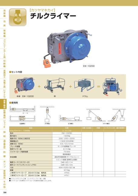 【カツヤマキカイ】チルクライマー■セット内容EW-1020D本体EW-1020D枠ドラム■使用例日極(3日保証)月極セーフティサービス料基本管理料商品チルクライマー1000㎏型式最大能力電源(50/60㎐)三相交流電動機出力速度(50/60㎐)ブレーキ装置専用ワイヤー径ワイヤーロープ破断強度安全装置電源コード(コネクター付)操作コード(ペンダントスイッチ付)寸法質量②専用ワイヤーロープ20mΦ10.0㎜販売品②専用ワイヤーロープ30mΦ10.0㎜販売品●スプリングエンド×2個エンドクリップ×1個付属●ワイヤーロープは専用ワイヤーロープの使用をお願いいたします。390仕様S-TK10WEW-1020D1000㎏200/200〜220V1.0kW(30分定格)4.6/5.5m/minモータ内蔵電磁ブレーキΦ10.0㎜73.5kN積算稼働計過負荷保護装置(サーマルリレー)リミット装置(過巻防止装置)2㎟×4芯×1m2㎟×3芯×3m494×526×621㎜67.0㎏HTK2HTK1
