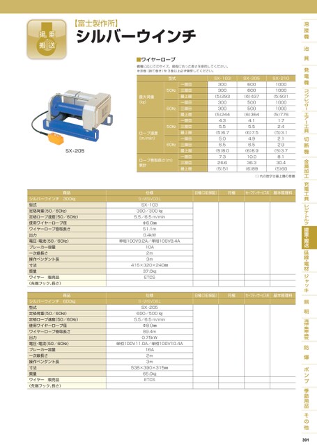 【富士製作所】シルバーウインチ■ワイヤーロープ機種に応じてのサイズ、揚程に合った長さを使用してください。※余巻(捨て巻き)を3巻以上必ず確保してください。型式50㎐60㎐50㎐60㎐最大荷重(㎏)ロープ速度(m/min)ロープ巻取長さ(m)累計一層目三層目最上層一層目三層目最上層一層目三層目最上層一層目三層目最上層一層目三層目最上層SX-103SX-205300300600600(5)293(6)437300300500500SX-21010001000(5)93110001000(5)244(6)364(5)7764.35.54.15.51.72.4(5)6.7(6)7.5(5)3.15.06.5(5)8.07.326.6(5)514.96.5(6)8.910.036.3(6)892.12.9(5)3.78.130.4(5)60()内の数字は最上層の巻層日極(3日保証)月極セーフティサービス料基本管理料日極(3日保証)月極セーフティサービス料基本管理料仕様S-WSV03LSX-103300/300㎏5.5/6.5m/minΦ6.0㎜51.1m0.4kW単相100V9.2A/単相100V8.4A10A2m3m415×320×240㎜37.0㎏ETCS仕様S-WSV06LSX-205600/500㎏5.5/6.5m/minΦ8.0㎜89.4m0.75kW単相100V11.0A/単相100V10.4A16A2m3m538×390×315㎜65.0㎏ETCS391SX-205商品シルバーウインチ300㎏型式定格荷重(50/60㎐)定格ロープ速度(50/60㎐)使用ワイヤーロープ径ワイヤーロープ巻取長さ出力電圧・電流(50/60㎐)ブレーカー容量一次線長さ操作ペンダント長寸法質量ワイヤー販売品(先端フック、長さ)商品シルバーウインチ600㎏型式定格荷重(50/60㎐)定格ロープ速度(50/60㎐)使用ワイヤーロープ径ワイヤーロープ巻取長さ出力電圧・電流(50/60㎐)ブレーカー容量一次線長さ操作ペンダント長寸法質量ワイヤー販売品(先端フック、長さ)