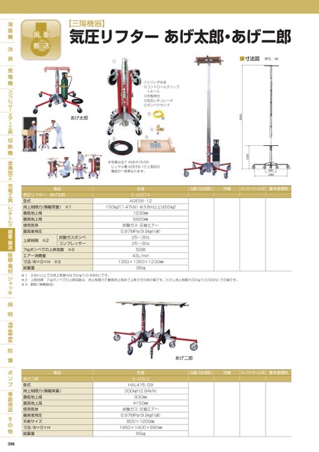 【三陽機器】気圧リフターあげ太郎・あげ二郎■寸法図単位:㎜日極(3日保証)月極セーフティサービス料基本管理料①②①シリンダ本体②コントロールグリップ+ホース③木製荷台④気圧レギュレータ⑤ボンベクランプ⑤④③※写真は全てAGE415-09レンタル機AGE56-12と部品の構成が一部異なります。仕様S-AGETAAGE56-12150㎏f(1.47kN)※3.8m以上は50㎏f1230㎜5600㎜炭酸ガス・圧縮エアー0.97MPa(9.9㎏f/㎠)25〜30s25〜30s50回43L/min1350×1350×1230㎜36㎏あげ太郎商品気圧リフターあげ太郎型式持上制限力(積載荷重)※1最低地上高最高地上高使用気体最高使用圧上昇時間※2炭酸ガスボンベコンプレッサー7㎏ボンベでの上昇回数※2エアー消費量寸法:W×D×H※3総重量※13.8m以上での持上制限力は50㎏f0.49kN)です。※2上昇時間・7㎏ボンベでの上昇回数は、持上制限力で最高持上高まで上昇させた時の値です。ただし持上制限力50㎏f0.50kN)での値です。※3脚部(車輪接地)あげ二郎日極(3日保証)月極セーフティサービス料基本管理料商品あげ二郎型式持上制限力(積載荷重)最低地上高最高地上高使用気体最高使用圧天板サイズ寸法:W×D×H総重量396仕様S-AGEJIHAL415-09300㎏f(2.94kN)930㎜4150㎜炭酸ガス・圧縮エアー0.97MPa(9.9㎏f/㎠)800×1200㎜1950×1400×990㎜65㎏