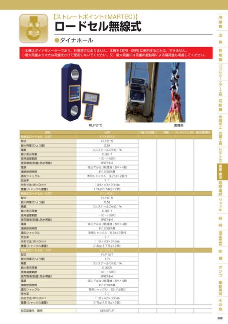 【ストレートポイント(MARTEC)】ロードセル無線式●ダイナホール◇本機はダイナモメーターであり、計量器ではありません。本機を「取引・証明」に使用することは、できません。◇最大荷重より大きな荷重をかけて使用しないでください。又、最大荷重には荷重の振動等による偏荷重も考慮してください。使用例日極(3日保証)月極セーフティサービス料基本管理料商品無線式ロードセル2.5T型式最大荷重(ひょう量)精度最小表示荷重使用温度範囲使用環境(防塵、防水等級)電源連続使用時間適応シャックル安全率外形寸法:W×D×H重量(シャックル重量)無線式ロードセル6.5T型式最大荷重(ひょう量)精度最小表示荷重使用温度範囲使用環境(防塵、防水等級)電源連続使用時間適応シャックル安全率外形寸法:W×D×H重量(シャックル重量)無線式ロードセル12T型式最大荷重(ひょう量)精度最小表示荷重使用温度範囲使用環境(防塵、防水等級)電源連続使用時間適応シャックル安全率外形寸法:W×D×H重量(シャックル重量)校正証書代販売RLP2T5仕様S-DHR2.5RLP2T52.5tフルスケールの±0.1%0.001tー10〜+50℃IP67※4単三アルカリ乾電池1.5V×4個約1200時間専用シャックル3.25t×2個付7:1104×43×204㎜1.5㎏(0.74㎏×2個)S-DHR6.5RLP6T56.5tフルスケールの±0.1%0.001tー10〜+50℃IP67※4単三アルカリ乾電池1.5V×4個約1200時間専用シャックル6.5t×2個付7:1113×43×249㎜2.4㎏(1.77㎏×2個)S-DHR12RLP12T12tフルスケールの±0.1%0.002tー10〜+50℃IP67※4単三アルカリ乾電池1.5V×4個約1200時間専用シャックル12t×2個付7:1113×47×305㎜3.7㎏(4.91㎏×2個)KENSRLP399