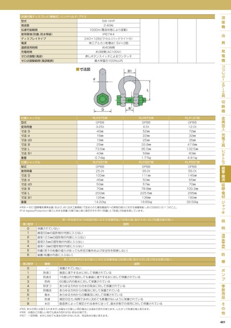 共通付属ディスプレイ(無線式)ハンドヘルド・プラス型式周波数伝達可能範囲使用環境(防塵、防水等級)ディスプレイタイプ電源連続使用時間充電時間ゼロ点調整(風袋)ゼロ点調整範囲(風袋範囲)240×128ピクセル(バックライト付)単三アルカリ乾電池1.5V×2個約40時間約3時間(AC100V)SW-HHP2.4G㎐1000m(電波状態により変動)IP67※4押しボタンスイッチによるワンタッチ最大荷重の100%以内■寸法図付属シャックル型式使用荷重寸法:D寸法:d寸法:d3寸法:B寸法:L寸法:B1重量付属シャックル型式使用荷重寸法:D寸法:d寸法:d3寸法:B寸法:L寸法:B1重量RLP2T5用RLP6T5用RLP12T用GPBB3.25t40㎜16㎜19㎜25㎜73.5㎜43㎜0.74㎏RLP25T用GPBB25.0t103㎜45㎜50㎜70㎜203㎜126㎜14.22㎏GPBB6.5t52㎜22㎜25㎜33.8㎜95.5㎜58㎜1.77㎏RLP35T用GPBB35.0t111㎜50㎜57㎜78.8㎜225.5㎜138㎜19.85㎏GPBB12.0t72㎜32㎜35㎜47.8㎜132.5㎜83㎜4.91㎏RLP55T用GPBB55.0t145㎜65㎜70㎜100.3㎜295㎜180㎜39.59㎏IP66=IEC(国際電気標準会議)およびJIS(日本工業規格)で定められた電気機器内への異物の侵入に対する保護等級(JISC0920)の1つのこと。IPはIngressProtection(侵入に対する保護)の略で後に続く数字がそれぞれ「防塵」と「防滴」の性能を表しています。第一特性数字は「外来固形物に対する保護等級」7段階分類、数が大きいほど防塵効果が高い第1数字0123456第2数字012345678説明保護されていない直径50㎜の固形物が内部に入らない直径12.5㎜の固形物が内部に入らない直径2.5㎜の固形物が内部に入らない直径1.0㎜の固形物が内部に入らない防塵(若干の粉塵の侵入があっても所定の動作および安全性を阻害しない)耐塵(粉塵が内部に入らない)第二特性数字は「水の侵入に対する保護等級」9段階分類、数が大きいほど防水効果が高い種類―防滴Ⅰ防滴Ⅱ防雨防まつ防噴流耐水防浸水圧説明保護されていない垂直に滴下する水に対して保護されている15度以内で傾斜しても垂直に滴下する水に対して保護されている60度以内の散水に対して保護されているあらゆる方向からの水の飛沫に対して保護されているあらゆる方向からの噴流に対して保護されているあらゆる方向からの暴噴流に対して保護されている規定の圧力、時間で水中に沈めても影響がないように保護されている製造者によって規定される条件に従って、潜水状態での使用に対して保護されているIP65:多少の雨には耐えられますが、台風などの激しい雨の場合には浸水の恐れがあります。したがって防滴仕様と言えます。IP66:台風などの激しい雨でも浸水の恐れがない防水仕様です。IP67:一定時間、水中に沈めても浸水の恐れがないため、完全防水仕様と言えます。401