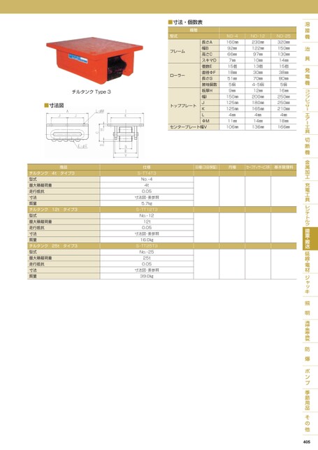 ■寸法・個数表機種型式フレームローラーチルタンクType3■寸法図トッププレート長さA幅B高さCスキマD個数E直径ΦF長さG接地個数板厚H幅IJKLΦMセンタープレート幅VNO-4160㎜92㎜66㎜7㎜15個18㎜51㎜5個9㎜150㎜125㎜125㎜4㎜11㎜106㎜NO-12230㎜122㎜97㎜10㎜13個30㎜70㎜4-5個12㎜200㎜180㎜165㎜4㎜14㎜136㎜NO-25320㎜150㎜130㎜14㎜15個38㎜80㎜5個16㎜250㎜250㎜210㎜4㎜18㎜166㎜日極(3日保証)月極セーフティサービス料基本管理料商品チルタンク4tタイプ3型式最大積載荷重走行抵抗寸法質量チルタンク12tタイプ3型式最大積載荷重走行抵抗寸法質量チルタンク25tタイプ3型式最大積載荷重走行抵抗寸法質量仕様S-TT4T3No.-44t0.05寸法図・表参照5.7㎏S-TT12T3No.-1212t0.05寸法図・表参照16.0㎏S-TT25T3No.-2525t0.05寸法図・表参照39.0㎏405