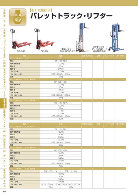 【をくだ屋技研】パレットトラック・リフターCP-10S商品パレットトラック1.0t型式最大積載荷重最低位最高位フォーク長寸法:W×L×H質量パレットトラック1.0t低床型型式最大積載荷重最低位最高位フォーク長寸法:W×L×H質量パレットトラック1.0t超低床型式最大積載荷重最低位最高位フォーク長寸法:W×L×H質量商品パレットトラック1.5tロング型式最大積載荷重最低位最高位フォーク長寸法:W×L×H質量パレットトラック1.5t低床型型式最大積載荷重最低位最高位フォーク長寸法:W×L×H質量パレットトラック1.5t両面用型式最大積載荷重最低位最高位フォーク長寸法:W×L×H質量408CP-15L電動リフターPLW-D650-25ハンドリフターPL-H1000-15(地域限定商品)日極(3日保証)月極セーフティサービス料基本管理料日極(3日保証)月極セーフティサービス料基本管理料仕様S-PT1CP-10S-1001000㎏80㎜200㎜1000㎜520×1390×1150㎜55㎏S-PT1LCP-10S-100H1000㎏65㎜185㎜1000㎜520×1390×1150㎜55㎏S-PT1SCPL-10S-107L1000㎏39㎜114㎜1070㎜520×1530×1120㎜62㎏仕様S-PT1512CP-15L-1221500㎏80㎜200㎜1220㎜685×1630×1170㎜83㎏S-PT15LCP-15S-107H1500㎏65㎜185㎜1070㎜520×1480×1170㎜74㎏S-PTRTCP-15S-114TCP-15L-1141500㎏80㎜180㎜1140㎜520×1660×1170㎜685×1660×1170㎜73㎏79㎏