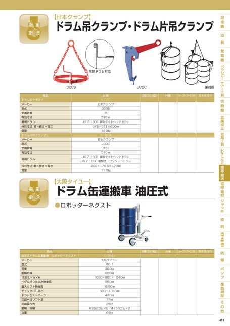 【日本クランプ】ドラム吊クランプ・ドラム片吊クランプ密閉ドラム対応300SJCDC使用例日極(3日保証)月極セーフティサービス料基本管理料商品ドラム吊クランプメーカー型式使用荷重有効寸法適用ドラム外形寸法:幅×長さ×高さ質量ドラム片吊クランプメーカー型式使用荷重有効寸法適用ドラム外形寸法:幅×長さ×高さ質量仕様S-DTC日本クランプ300S1t570㎜JISZ1601鋼製タイトヘッドドラム572×572×650㎜13.0㎏S-DTCK日本クランプJCDC0.5t570㎜JISZ1601鋼製タイトヘッドドラムJISZ1600鋼製オープンヘッドドラム200×176.5×570㎜11.0㎏【大阪タイユ―】ドラム缶運搬車油圧式●ロボッターネクスト日極(3日保証)月極セーフティサービス料基本管理料商品油圧式ドラム缶運搬車ロボッターネクストメーカー型式荷重前輪内幅寸法:L×W×Hペダル折りたたみ時全長最大リフト時全高チャック(爪)高さドラム缶ストローク足踏一回リフト量足踏操作力前輪/後輪自重仕様S-DMU大阪タイユ―RX-1300㎏650㎜1090×850×1040㎜980㎜1550㎜830〜1340㎜430㎜17㎜25㎏Φ250ゴム×2/Φ150ゴム×264㎏411