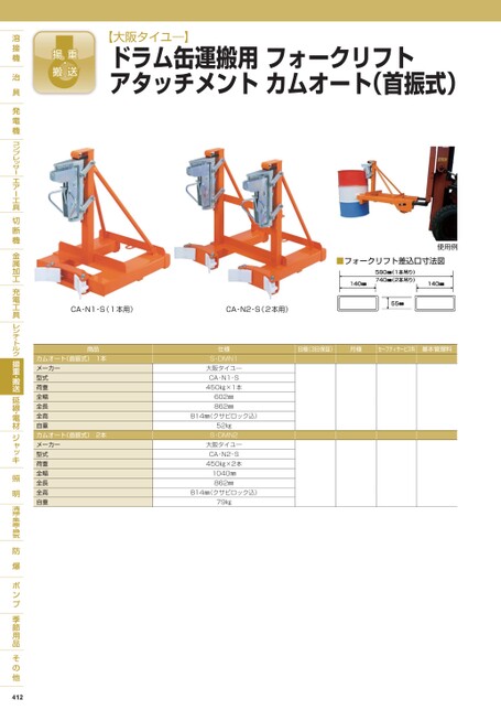 【大阪タイユ―】ドラム缶運搬用フォークリフトアタッチメントカムオート(首振式)■フォークリフト差込口寸法図使用例日極(3日保証)月極セーフティサービス料基本管理料CA-N1-S(1本用)CA-N2-S(2本用)商品カムオート(首振式)1本メーカー型式荷重全幅全長全高自重カムオート(首振式)2本メーカー型式荷重全幅全長全高自重仕様S-DMN1大阪タイユ―CA-N1-S450㎏×1本602㎜862㎜814㎜(クサビロック込)52㎏S-DMN2大阪タイユ―CA-N2-S450㎏×2本1040㎜862㎜814㎜(クサビロック込)79㎏412