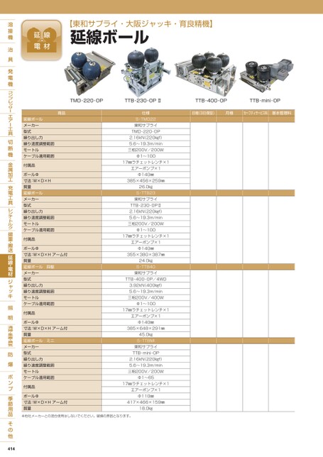 【東和サプライ・大阪ジャッキ・育良精機】延線ボールTMD-220-OPTTB-230-OPⅡTTB-400-OPTTB-mini-OP日極(3日保証)月極セーフティサービス料基本管理料商品延線ボールメーカー型式繰り出し力繰り速度調整範囲モートルケーブル適用範囲付属品ボールΦ寸法:W×D×H質量延線ボールメーカー型式繰り出し力繰り速度調整範囲モートルケーブル適用範囲付属品ボールΦ寸法:W×D×Hアーム付質量延線ボール四駆メーカー型式繰り出し力繰り速度調整範囲モートルケーブル適用範囲付属品ボールΦ寸法:W×D×Hアーム付質量延線ボールミニメーカー型式繰り出し力繰り速度調整範囲モートルケーブル適用範囲付属品ボールΦ寸法:W×D×Hアーム付質量仕様S-TMD22東和サプライTMD-220-OP2.16kN(220㎏f)5.6〜19.3m/min三相200V/200WΦ1〜10017㎜ラチェットレンチ×1エアーポンプ×1Φ140㎜385×456×259㎜26.0㎏S-TTB23東和サプライTTB-230-OPⅡ2.16kN(220㎏f)5.6〜19.3m/min三相200V/200WΦ1〜10017㎜ラチェットレンチ×1エアーポンプ×1Φ140㎜355×380×387㎜24.0㎏S-TTB40東和サプライTTB-400-OP/4WD3.92kN(400㎏f)5.6〜19.3m/min三相200V/400WΦ1〜10017㎜ラチェットレンチ×1エアーポンプ×1Φ140㎜385×648×291㎜45.0㎏S-TTBMI東和サプライTTB-mini-OP2.16kN(220㎏f)5.6〜19.3m/min三相200V/200WΦ1〜6517㎜ラチェットレンチ×1エアーポンプ×1Φ110㎜417×466×159㎜18.0㎏※他社メーカーとの混合使用はしないでください。破損の原因となります。414