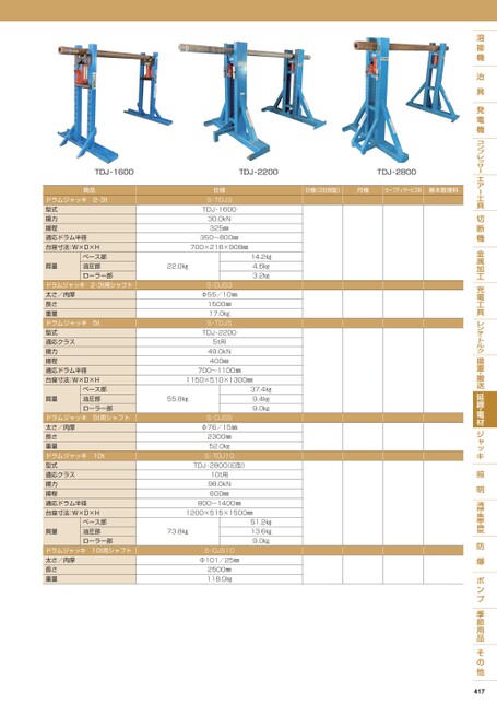 TDJ-1600TDJ-2200TDJ-2800日極(3日保証)月極セーフティサービス料基本管理料商品ドラムジャッキ2・3t型式揚力揚程適応ドラム半径台座寸法:W×D×H質量ベース部油圧部ローラー部ドラムジャッキ2・3t用シャフト太さ/肉厚長さ重量ドラムジャッキ5t型式適応クラス揚力揚程適応ドラム半径台座寸法:W×D×H質量ベース部油圧部ローラー部ドラムジャッキ5t用シャフト太さ/肉厚長さ重量ドラムジャッキ10t型式適応クラス揚力揚程適応ドラム半径台座寸法:W×D×H質量ベース部油圧部ローラー部ドラムジャッキ10t用シャフト太さ/肉厚長さ重量仕様S-TDJ3TDJ-160030.0kN325㎜350〜800㎜700×218×908㎜22.0㎏14.2㎏4.6㎏3.2㎏S-DJS3Φ55/10㎜1500㎜17.0㎏S-TDJ5TDJ-22005t用49.0kN400㎜700〜1100㎜1150×510×1300㎜55.8㎏37.4㎏9.4㎏9.0㎏S-DJS5Φ76/15㎜2300㎜52.0㎏S-TDJ10TDJ-2800(旧型)10t用98.0kN600㎜800〜1400㎜1200×515×1500㎜73.8㎏51.2㎏13.6㎏9.0㎏S-DJS10Φ101/25㎜2500㎜118.0㎏417