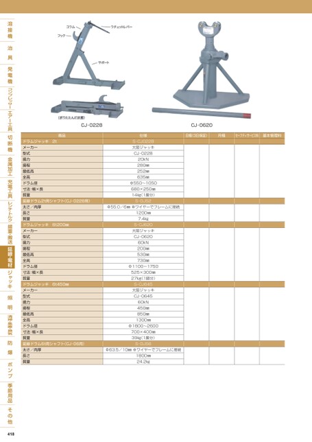 CJ-0228CJ-0620日極(3日保証)月極セーフティサービス料基本管理料商品ドラムジャッキ2tメーカー型式揚力揚程最低高全高ドラム径寸法:幅×長質量延線ドラム2t用シャフト(CJ-0228用)太さ/肉厚長さ質量ドラムジャッキ6t200㎜メーカー型式揚力揚程最低高全高ドラム径寸法:幅×長質量ドラムジャッキ6t450㎜メーカー型式揚力揚程最低高全高ドラム径寸法:幅×長質量延線ドラム6t用シャフト(CJ-06用)太さ/肉厚長さ質量仕様S-CJ0228大阪ジャッキCJ-022820kN280㎜252㎜635㎜Φ550〜1050680×250㎜14㎏(1脚分)S-DJS2Φ55.0/6㎜※ワイヤーでフレームに接続1200㎜7.4㎏S-CJ620大阪ジャッキCJ-062060kN200㎜530㎜730㎜Φ1100〜1750525×300㎜27kg(1脚分)S-CJ645大阪ジャッキCJ-064560kN450㎜850㎜1300㎜Φ1800〜2600700×400㎜39㎏(1脚分)S-DJS6Φ63.5/10㎜※ワイヤーでフレームに接続1800㎜24.2㎏418