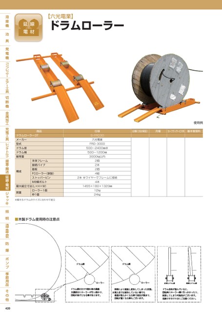 【六光電業】ドラムローラー日極(3日保証)月極セーフティサービス料基本管理料使用例仕様S-FRD30六光電業FRD-3000500〜2400㎜Φ500〜1200㎜3000㎏以内2個2本2個4組2本※ワイヤーでフレームに接続4本1455×180×1320㎜12㎏24㎏商品ドラムローラー3Tメーカー型式ドラム径ドラム幅耐荷重構成本体フレーム接続パイプ踏板FCローラー(鉄製)ストッパーピンM8蝶ボルト最大組立寸法(L×H×W)ローラー1個枠1個質量※載せるドラムのサイズに合わせて組立■木製ドラム使用時の注意点420