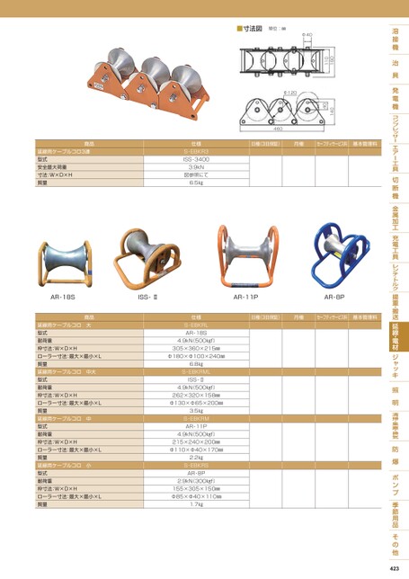 日極(3日保証)月極セーフティサービス料基本管理料16011014040Φ120460■寸法図単位:㎜Φ40商品延線用ケーブルコロ3連型式安全最大荷重寸法:W×D×H質量仕様S-EBKR3ISS-34003.9kN図参照にて6.5㎏AR-18SISS-ⅡAR-11PAR-8P日極(3日保証)月極セーフティサービス料基本管理料商品延線用ケーブルコロ大型式耐荷重枠寸法:W×D×Hローラー寸法:最大×最小×L質量延線用ケーブルコロ中大型式耐荷重枠寸法:W×D×Hローラー寸法:最大×最小×L質量延線用ケーブルコロ中型式耐荷重枠寸法:W×D×Hローラー寸法:最大×最小×L質量延線用ケーブルコロ小型式耐荷重枠寸法:W×D×Hローラー寸法:最大×最小×L質量仕様S-EBKRLAR-18S4.9kN(500㎏f)305×360×215㎜Φ180×Φ100×240㎜6.8㎏S-EBKRMLISS-Ⅱ4.9kN(500㎏f)262×320×158㎜Φ130×Φ65×200㎜3.5㎏S-EBKRMAR-11P4.9kN(500㎏f)215×240×200㎜Φ110×Φ40×170㎜2.2㎏S-EBKRSAR-8P2.9kN(300㎏f)155×305×150㎜Φ85×Φ40×110㎜1.7㎏423