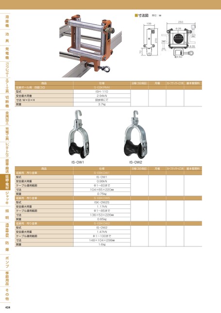 250Φ28Φ110最大50Φ28■寸法図単位:㎜10827072日極(3日保証)月極セーフティサービス料基本管理料商品延線ボール用四面コロ型式安全最大荷重寸法:W×D×H質量仕様S-EBKRM4ISH-1102.94kN図参照にて3.7㎏IS-OW1IS-OW2日極(3日保証)月極セーフティサービス料基本管理料商品延線用吊り金車型式安全最大荷重ケーブル適用範囲寸法質量延線用吊り金車型式安全最大荷重ケーブル適用範囲寸法質量延線用吊り金車型式安全最大荷重ケーブル適用範囲寸法質量仕様S-EBKOW1IS-OW10.98kNΦ1〜60まで104×65×220㎜0.75㎏S-EBKOWSISK-OW2S1.17kNΦ1〜85まで136×53×226㎜0.85㎏S-EBKOW2IS-OW21.47kNΦ1〜100まで148×104×298㎜1.6㎏424