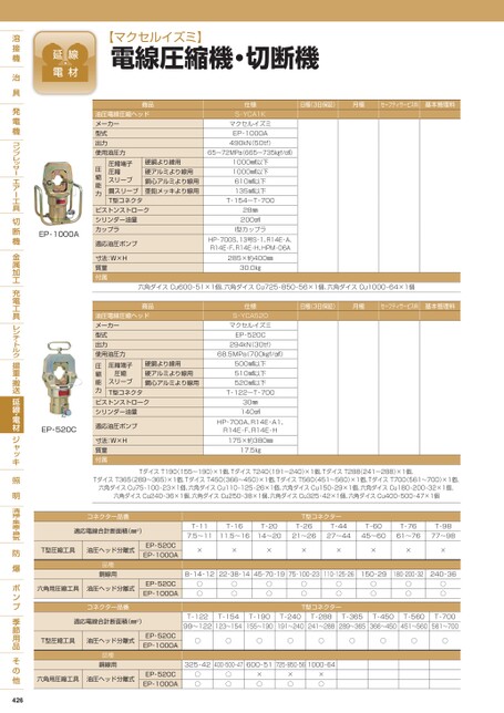 日極(3日保証)月極セーフティサービス料基本管理料仕様S-YCA1KマクセルイズミEP-1000A490kN(50tf)65〜72MPa665〜735㎏f/㎠)1000㎟以下1000㎟以下610㎟以下135㎟以下T-154〜T-70028㎜200㎤I型カップラHP-700S、13号S-1、R14E-A、R14E-F、R14E-H、HPM-06A285×約400㎜30.0㎏硬銅より線用硬アルミより線用銅心アルミより線用亜鉛メッキより線用圧縮端子圧縮スリーブ鋼スリーブT型コネクタ圧縮能力商品油圧電線圧縮ヘッドメーカー型式出力使用油圧力ピストンストロークシリンダー油量カップラ適応油圧ポンプ寸法:W×H質量付属EP-1000A六角ダイスCu600-51×1個、六角ダイスCu725-850-56×1個、六角ダイスCu1000-64×1個日極(3日保証)月極セーフティサービス料基本管理料仕様S-YCA520マクセルイズミEP-520C294kN(30tf)68.5MPa(700㎏f/㎠)500㎟以下510㎟以下520㎟以下T-122〜T-70030㎜140㎤HP-700A、R14E-A1、R14E-F、R14E-H175×約380㎜17.5㎏硬銅より線用硬アルミより線用鋼心アルミより線用圧縮端子圧縮スリーブT型コネクタ圧縮能力商品油圧電線圧縮ヘッドメーカー型式出力使用油圧力EP-520Cピストンストロークシリンダー油量適応油圧ポンプ寸法:W×H質量付属【マクセルイズミ】電線圧縮機・切断機TダイスT190(155〜190)×1個、TダイスT240(191〜240)×1個、TダイスT288(241〜288)×1個、TダイスT365(289〜365)×1個、TダイスT450(366〜450)×1個、TダイスT560(451〜560)×1個、TダイスT700(561〜700)×1個、六角ダイスCu75-100-23×1個、六角ダイスCu110-125-26×1個、六角ダイスCu150-29×1個、六角ダイスCu180-200-32×1個、六角ダイスCu240-36×1個、六角ダイスCu250-38×1個、六角ダイスCu325-42×1個、六角ダイスCu400-500-47×1個コネクター品番適応電線合計断面積(㎜2)T-11T-16T-207.5〜1111.5〜1614〜20T型コネクターT-2621〜26T-4427〜44T-6045〜60T-7661〜76T-9877〜98T型圧縮工具油圧ヘッド分離式EP-520CEP-1000A品種銅線用××××××××8-14-1222-38-1445-70-1975-100-23110-125-26150-29180-200-32240-36六角用圧縮工具油圧ヘッド分離式EP-520CEP-1000A○○○○○○○○○○T型コネクター○○○○○○コネクター品番適応電線合計断面積(㎜2)T型圧縮工具油圧ヘッド分離式EP-520CEP-1000AT-12299〜122T-154123〜154T-190155〜190T-240191〜240T-288241〜288T-365289〜365T-450366〜450T-560451〜560T-700561〜700○○○○○○○○○品種銅線用六角用圧縮工具油圧ヘッド分離式325-42400-500-47600-51725-850-561000-64EP-520CEP-1000A○○○○×○×○×○426