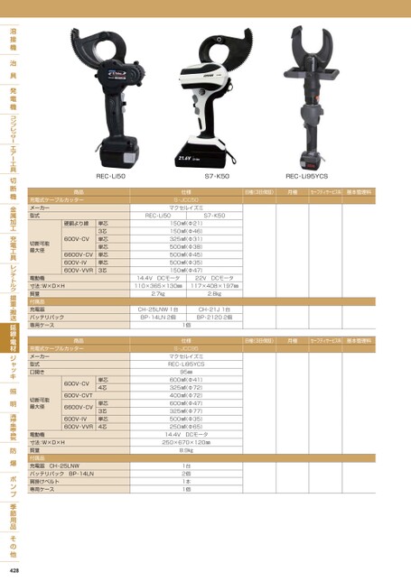 REC-Li50S7-K50REC-Li95YCS日極(3日保証)月極セーフティサービス料基本管理料日極(3日保証)月極セーフティサービス料基本管理料商品充電式ケーブルカッターメーカー型式切断可能最大径硬銅より線600V-CV6600V-CV600V-IV600V-VVR単芯3芯単芯単芯単芯単芯3芯電動機寸法:W×D×H質量付属品充電器バッテリパック専用ケース商品充電式ケーブルカッターメーカー型式口開き切断可能最大径600V-CV600V-CVT6600V-CV600V-IV600V-VVR単芯4芯単芯3芯単芯4芯電動機寸法:W×D×H質量付属品充電器CH-25LNWバッテリパックBP-14LN肩掛けベルト専用ケース仕様S-JCC50マクセルイズミREC-Li50S7-K50150㎟(Φ21)150㎟(Φ46)325㎟(Φ31)500㎟(Φ38)500㎟(Φ45)500㎟(Φ35)150㎟(Φ47)14.4VDCモータ22VDCモータ110×365×130㎜117×408×197㎜2.7㎏2.8㎏CH-25LNW1台BP-14LN2個CH-21J1台BP-21202個1個仕様S-JCC95マクセルイズミREC-Li95YCS95㎜600㎟(Φ41)325㎟(Φ72)400㎟(Φ72)600㎟(Φ47)325㎟(Φ77)500㎟(Φ35)250㎟(Φ65)14.4VDCモータ250×670×120㎜8.9㎏1台2個1本1個428