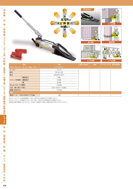 安全弁付日極(3日保証)月極セーフティサービス料基本管理料商品パワーウエッジポンプ一体型30tメーカー型式能力ウエッジ先端部最低高さ最高高さ幅ラムストローク(揚程)寸法幅×長さ×高さ質量(本体のみ)付属専用ケース150×605×175㎜仕様S-WRM30CダイキDFJS-60300kN(30t)5㎜34㎜62㎜140㎜62×550×160㎜12.0㎏1個※ウエッジジャッキは許容荷重の70%〜80%内で余裕をもちご使用ください。※ウエッジジャッキは最大ストロークの70%〜80%内で余裕をもちご使用ください。※指定の油圧作動油(ISOVG15〜VG32)を給油口に給油し油面が見えるまで入れてください。436
