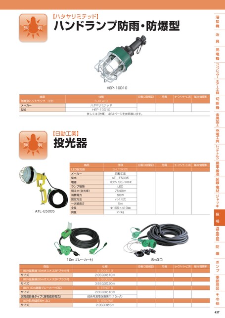 【ハタヤリミテッド】ハンドランプ防雨・防爆型商品防爆型ハンドランプLEDメーカー型式HEP-10D10仕様S-HLALBハタヤリミテッドHEP-10D10日極(3日保証)月極セーフティサービス料基本管理料詳しくは〔防爆〕464ページを参照願います。【日動工業】投光器商品LED投光器メーカー型式電源ランプ種類明るさ(全光束)消費電力固定方法一次線長さ全長質量仕様S-LTOK05日動工業ATL-E5005100V50/60㎐LED7540lm50Wバイス式5mΦ195×419㎜2.6㎏ATL-E5005日極(3日保証)月極セーフティサービス料基本管理料10mブレーカー付5m3口商品100V延長線10mオスメス3Pプラグ付サイズ100V延長線20mオスメス3Pプラグ付サイズ100V10m漏電ブレーカー付3口サイズ漏電遮断機タイプ(漏電遮断電流)100V防雨延長5m3口サイズ仕様S-203C102.0SQ3芯10mS-353C203.5SQ3芯20mS-1ENC1B2.0SQ3芯10m過負荷漏電保護兼用(15mA)S-1ENCW52.0SQ3芯5m日極(3日保証)月極セーフティサービス料基本管理料437