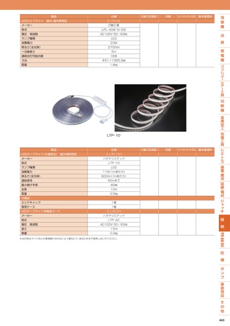 日極(3日保証)月極セーフティサービス料基本管理料商品LEDパイプライト屋内・屋外兼用型メーカー型式電圧周波数ランプ種類消費電力明るさ(全光束)一次線長さ連続点灯可能台数寸法質量仕様S-LPL04日動工業LPL-40W-N-SWAC100V50/60㎐LED23W2700lm5m18本Φ51×1365.2㎜1.6㎏日極(3日保証)月極セーフティサービス料基本管理料商品LEDテープライト(片面発光)屋外用防雨型メーカー型式ランプ種類消費電力明るさ(全光束)連結使用最小曲げ半径全長質量付属品エンドキャップ専用ケースLEDテープライト用電源コードメーカー型式電圧周波数長さ質量LTP-10仕様S-LRL10HハタヤリミテッドLTP-10LED11W(1mあたり)900lm(1mあたり)50mまで40㎜10m2.0㎏1個1個S-LRLDHハタヤリミテッドLTP-ACAC100V50/60㎐1.5m0.3㎏※点灯時はライト同士が直接触れ合わないよう重ねたり、束ねたままで使用しないでください。443