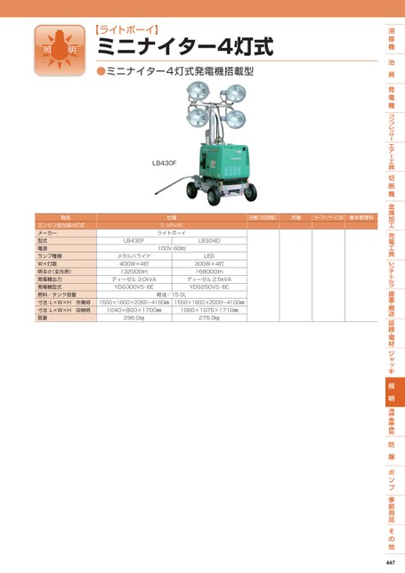 【ライトボーイ】ミニナイター4灯式●ミニナイター4灯式発電機搭載型LB430F商品エンジン投光器4灯式メーカー型式電源ランプ種類W×灯数明るさ(全光束)発電機出力発電機型式燃料/タンク容量寸法:L×W×H作業時寸法:L×W×H収納時質量仕様S-MN46ライトボーイ100V60㎐LB304DLED300W×4灯168000lmディーゼル2.5kVAYDG250VS-6ELB430Fメタルハライド400W×4灯132000lmディーゼル3.0kVAYDG300VS-6E軽油/15.0L1550×1600×2060〜4160㎜1550×1600×2000〜4100㎜1040×800×1700㎜1060×1075×1710㎜296.0㎏275.0㎏日極(3日保証)月極セーフティサービス料基本管理料447