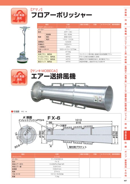 【アマノ】フロアーポリッシャー日極(3日保証)月極セーフティサービス料基本管理料コンクリート等の固い表面の洗浄用硬質ブラシPタイル等の洗浄磨きに使用頑固な汚れや堆積物を削り、剥す剛毛ブラシ床面を研磨し、塗装汚れなども剥がす商品フロアーポリッシャーメーカー型式電源周波数電圧電流消費電力作業能力一次線長さ寸法:L×W×H質量洗浄ブラシ販売品ナイロンブラシ販売品ワイヤーブラシ販売品砥石パッド販売品仕様S-FPアマノAFP-14050/60㎐単相100V13.0/12.0A1200W600㎡/h20m500×410×1270㎜37.0㎏HFP1HFP2HFP3HFP4【サンキMOBECA】エアー送排風機■寸法図単位:㎜商品フリエックスメーカー型式供給エアー圧力供給エアー量総風量風速寸法:H×D質量仕様S-FX6サンキMOBECAFX-60.49MPa(5㎏f/㎠)3.6㎥/min109㎥/min27m/s1013×Φ292㎜7.0㎏日極(3日保証)月極セーフティサービス料基本管理料457