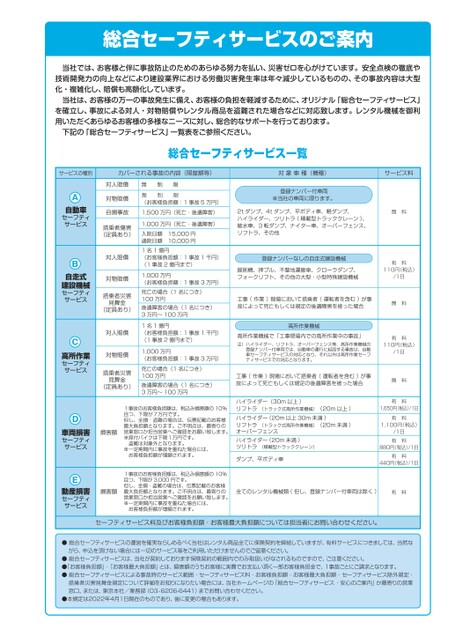 当社では、お客様と伴に事故防止のためのあらゆる努力を払い、災害ゼロを心がけています。安全点検の徹底や技術開発力の向上などにより建設業界における労働災害発生率は年々減少しているものの、その事故内容は大型化・複雑化し、賠償も高額化しています。当社は、お客様の万一の事故発生に備え、お客様の負担を軽減するために、オリジナル「総合セーフティサービス」を確立し、事故による対人・対物賠償やレンタル商品を盗難された場合などに対応致します。レンタル機械を御利用いただくあらゆるお客様の多様なニーズに対し、総合的なサポートを行っております。下記の「総合セーフティサービス」一覧表をご参照ください。無制限無料110円(税込)有料/1日無料110円(税込)有料/1日無料有料1,650円(税込)/1日1,100円(税込)有料/1日有料880円(税込)/1日有料440円(税込)/1日有料●総合セーフティサービスの運営を確実ならしめるべく当社はレンタル商品全てに保険契約を締結していますが、有料サービスにつきましては、当然ながら、申込を頂けない場合には一切のサービス等をご利用いただけませんのでご留意ください。●総合セーフティサービスは、当社が契約しております保険契約の範囲内でのみ取扱いがなされるものですので、ご注意ください。●「お客様負担額」・「お客様最大負担額」とは、損害額のうちお客様に実費でお支払い頂く一部お客様負担金で、1事故ごとにご請求となります。●総合セーフティサービスによる事故時のサービス範囲・セーフティサービス料・お客様負担額・お客様最大負担額・セーフティサービス除外規定・搭乗者災害見舞金規定について詳細をお知りになりたい場合には、当社ホームページの「総合セーフティサービス・安心のご案内」か最寄りの営業窓口、または、東京本社/業務部(03-6206-6441)までお問い合わせください。●本規定は2022年4月1日現在のものであり、後に変更の場合もあります。