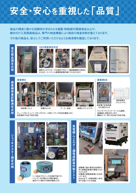 安全・安心を重視した「品質」商品の精度と確かな信頼性が求められる揚重・移動据付関連商品および、締め付け工具関連商品は、専門の検査機器により独自の検査体制を整えております。その他の商品も、安心してご利用いただけるよう点検清掃を徹底しております。100V機器測定状況通常のメガテスターでは測定できない二重絶縁機械の測定も行えます。コードリール漏電遮断器作動テストも行えます。揚重機5t揚重機30t測定機へセット荷重をかけるデーター送信結果をプリントアウトチェーンブロック、レバーブロックのブレーキ滑り、クラッチ状況を確認します。各営業所で5tまで対応可能。測定結果をプリントアウト測定機で定格荷重10%増をかけるウインチ(マイティプーラー)にも運用。3回繰返し測定を行います。機械センター等では30tまで対応可能。試験機で漏れ電流を仮想的に作り漏電遮断器が機能するかテストします。分電盤の漏電遮断器にも対応しています。30mA以下、作動時間0.1秒以内で作動・テストを実施。発電機・ウエルダー漏電遮断器作動テスト1〜100tまでのジャッキを測定可能です。シリンダー内の膨らみやを検知し油圧オイル漏れの有無を確認します。電気備品測定点検揚重機荷重試験測定点検ジャッキテスター測定点検