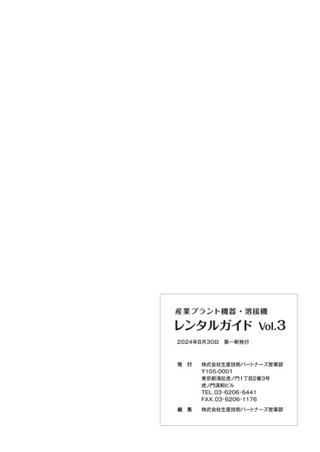 産業プラント機器・溶接機レンタルガイドVol.32024年8月30日第一刷発行発行編集株式会社生産技術パートナーズ営業部〒105-0001東京都港区虎ノ門1丁目2番3号虎ノ門清和ビルTEL.03-6206-6441FAX.03-6206-1176株式会社生産技術パートナーズ営業部